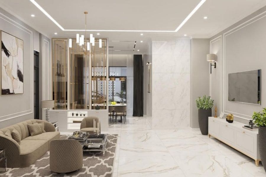Phong cách tân cổ điển kết hợp nét đẹp cổ điển với yếu tố hiện đại. Các chi tiết chạm khắc tinh xảo và vật liệu sang trọng như: Gỗ tự nhiên và đá được sử dụng để tạo điểm nhấn cho không gian. Ngoài ra, màu sắc ấm áp và các món đồ nội thất có hình dáng truyền thống góp phần tạo ra vẻ đẹp quyến rũ và lịch lãm. Sự hài hòa giữa các yếu tố cổ điển và hiện đại tạo nên không khí sang trọng và thoải mái.