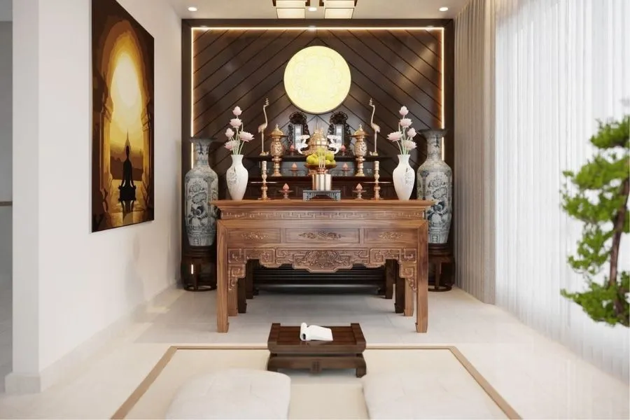 Màu sắc phòng thờ nên ưu tiên các tông trung tính như vàng nhạt, xám hoặc trắng ngà. Những màu này tạo cảm giác ấm và trang trọng. Bàn thờ thường dùng gỗ tự nhiên để giữ sự bền và phù hợp tổng thể. Vật phẩm trang trí bằng gỗ, đồng hoặc gốm sứ giúp không gian trông hài hòa hơn mà không gây rối mắt.