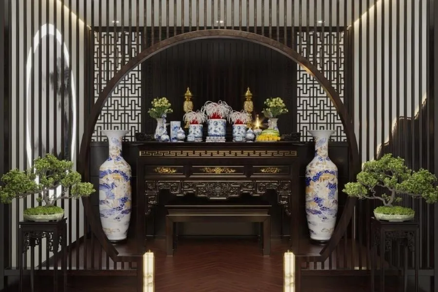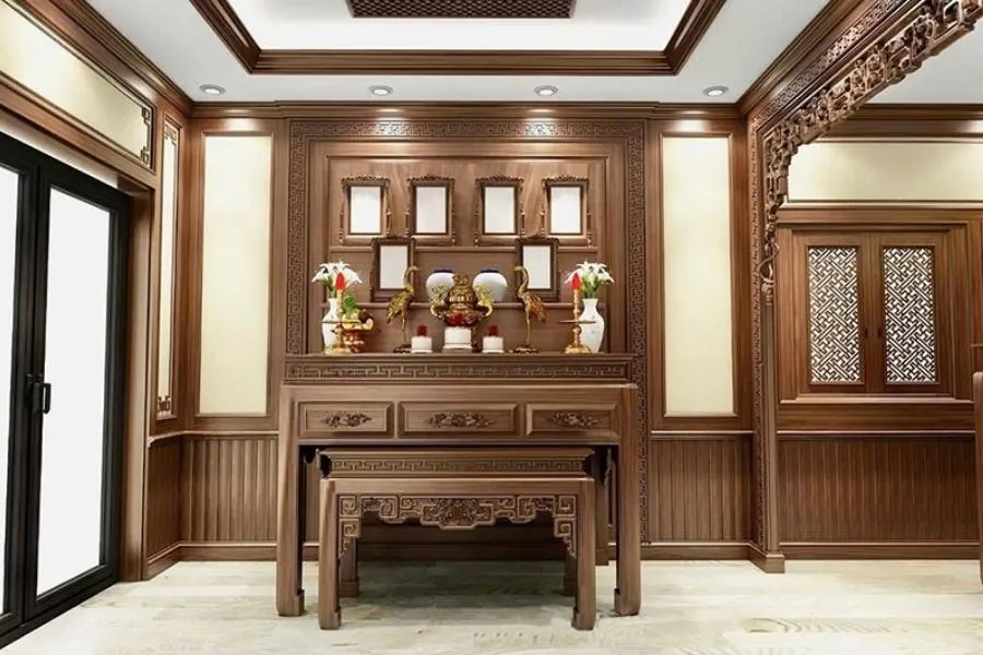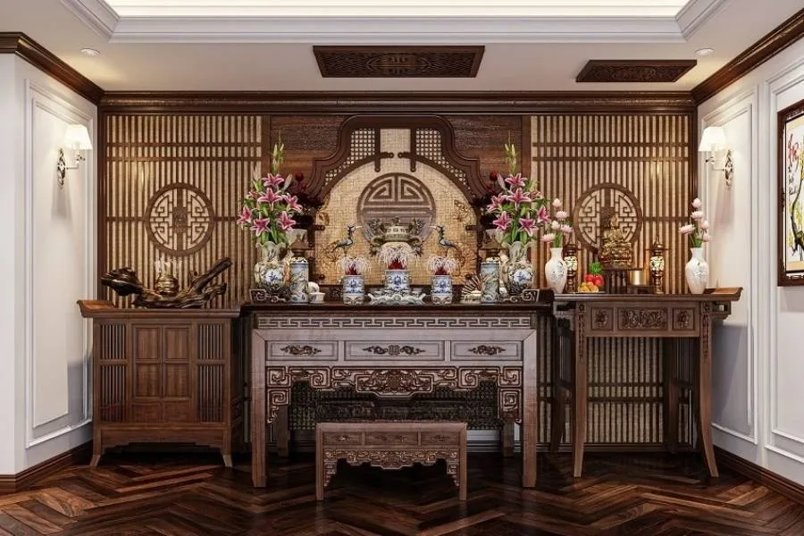 Đây là phong cách được nhiều gia đình Việt lựa chọn. Bàn thờ thường làm từ gỗ tự nhiên, màu nâu trầm hoặc đỏ sậm. Hoa văn rồng, phượng hoặc họa tiết cổ truyền xuất hiện nhiều hơn để giữ nét văn hóa. Không gian tập trung sự trang nghiêm, bố trí theo chuẩn phong tục từ xưa đến nay.