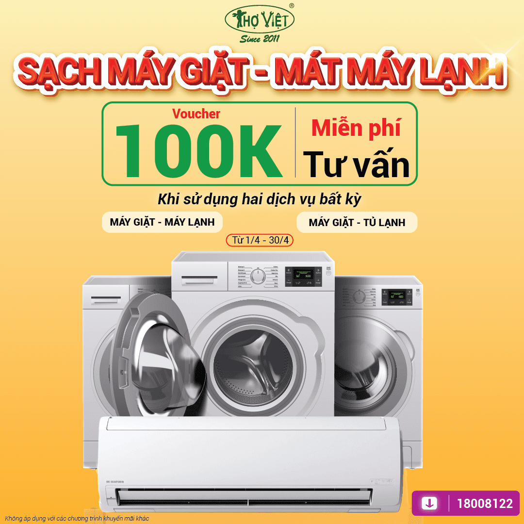 Bạn đang tìm dịch vụ vệ sinh máy giặt hay vệ sinh máy lạnh chuyên nghiệp với ưu đãi hấp dẫn? Đừng bỏ lỡ cơ hội giảm ngay 100k khi đặt lịch vệ sinh máy giặt kèm vệ sinh máy lạnh tại Thợ Việt. Chương trình khuyến mãi giới hạn hết tháng 4, nhanh tay đặt lịch ngay qua tổng đài miễn phí 1800 8122 để tiết kiệm chi phí!