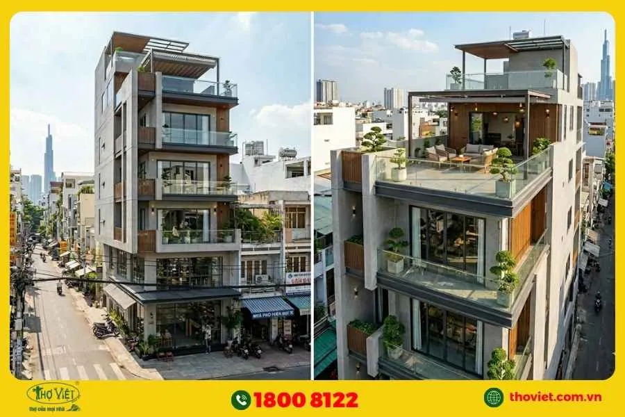Thiết kế nhà phố 7 tầng phù hợp từ nhà ở gia đình đông người, kết hợp kinh doanh đến văn phòng làm việc trên cùng công trình. Bài viết sau, Thợ Việt sẽ tổng hợp 99+ mẫu thiết kế nhà phố 7 tầng đẹp từ mặt tiền hẹp đến rộng để quý anh/chị tham khảo.