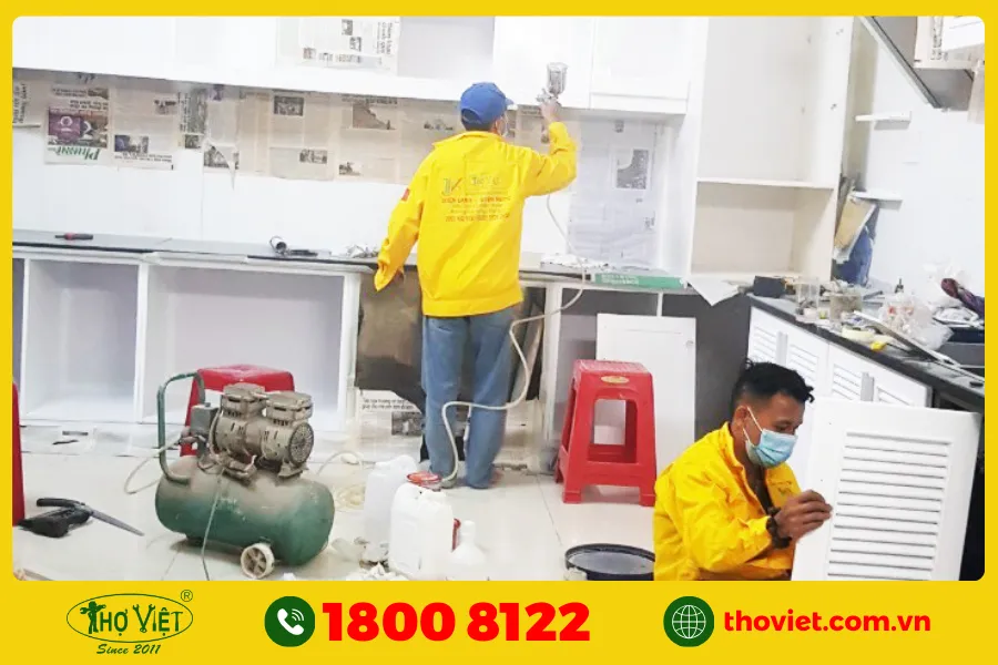 Tủ bếp là khu vực thường xuyên tiếp xúc với hơi nước, dầu mỡ và nhiệt độ cao nên dễ bị ẩm, ám mùi và bong sơn. Nguyên nhân chủ yếu do không vệ sinh đúng cách hoặc lớp sơn cũ đã xuống cấp theo thời gian. Thợ Việt nhận sơn lại toàn bộ tủ bếp từ cánh, hộc kéo đến mặt bên, giúp bề mặt sáng sạch hơn, hạn chế thấm nước và thuận tiện khi lau chùi.