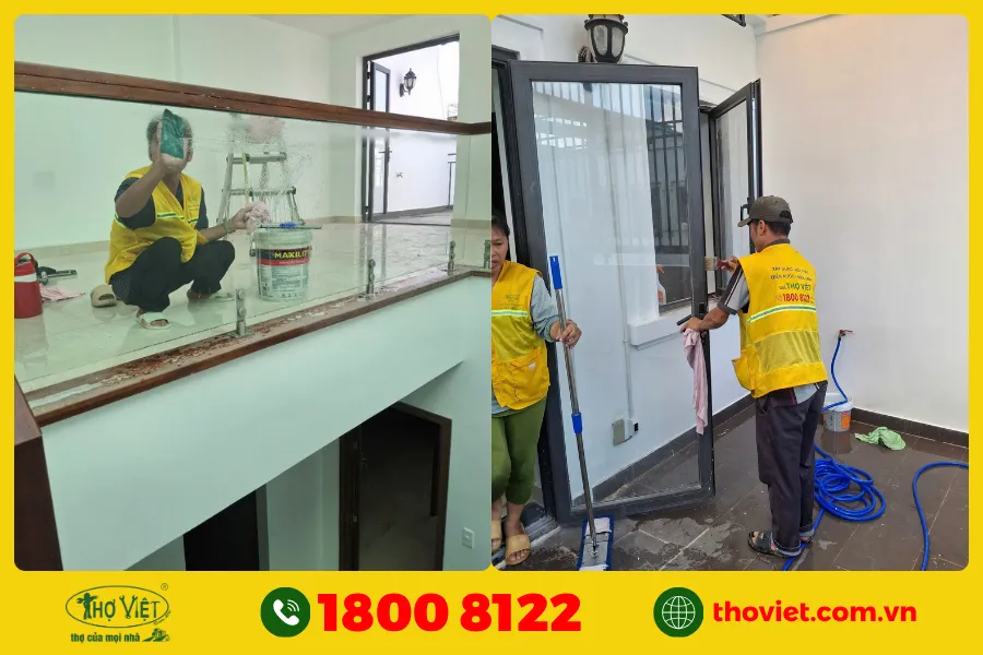 Sau khi lau kính xong, đội ngũ giám sát của Thợ Việt kiểm tra kỹ từng khu vực để đảm bảo không còn vết bẩn hay vệt nước. Cuối cùng, công trình được bàn giao sạch đẹp, sáng bóng và đạt tiêu chuẩn thẩm mỹ cao.
